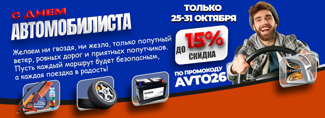 Ваш автомобиль заслужил лучшего! В честь общего праздника мы дарим скидки до 15% на самые важные товары для вас и вашего автомобиля: шины, диски, аккумуляторы и не только.